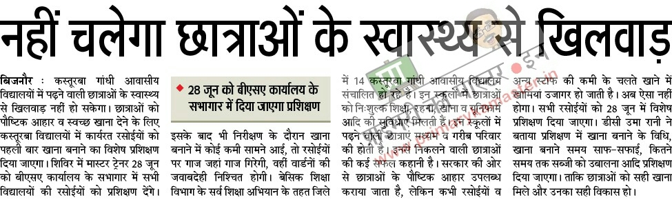 कस्तूरबा गांधी आवासीय विद्यालयों में पढ़ने वाली छात्रओं के स्वास्थ्य से खिलवाड़ नहीं हो सकेगा। छात्रओं को पौष्टिक आहार व स्वच्छ खाना देने के लिए कस्तूरबा विद्यालयों में कार्यरत रसोईयों को पहली बार खाना बनाने का विशेष प्रशिक्षण दिया जाएगा। शिविर में मास्टर ट्रेनर 28 जून को बीएसए कार्यालय के सभागार में सभी विद्यालयों की रसोईयों को प्रशिक्षण देंगे। इसके बाद भी निरीक्षण के दौरान खाना बनाने में कोई कमी सामने आई, तो रसोईयों पर गाज जहां गाज गिरेगी, वहीं वार्डनों की जवाबदेही निश्चित होगी। बेसिक शिक्षा विभाग के सर्व शिक्षा अभियान के तहत जिले में 14 कस्तूरबा गांधी आवासीय विद्यालय संचालित हो रहे हैं। इन स्कूलों में छात्रओं को नि:शुल्क शिक्षा, रहना, खाना व यूनिफार्म आदि की सुविधाएं मिलती हैं। इन स्कूलों में पढ़ने वाली छात्रएं मध्यम व गरीब परिवार की होती है। इनसे निकलने वाली छात्रओं की कई सफल कहानी है। सरकार की ओर से छात्रओं के पौष्टिक आहार उपलब्ध कराया जाता है, लेकिन कभी रसोईयों व अन्य स्टाफ की कमी के चलते खाने में खामियां उजागर हो जाती है। अब ऐसा नहीं होगा। सभी रसोईयों को 28 जून में विशेष प्रशिक्षण दिया जाएगा। डीसी उमा रानी ने बताया प्रशिक्षण में खाना बनाने के विधि, खाना बनाने समय साफ-सफाई, कितने समय तक सब्जी को उबालना आदि प्रशिक्षण दिया जाएगा। ताकि छात्रओं को सही खाना मिले और उनका सही विकास हो।28 जून को बीएसए कार्यालय के सभागार में दिया जाएगा प्रशिक्षण