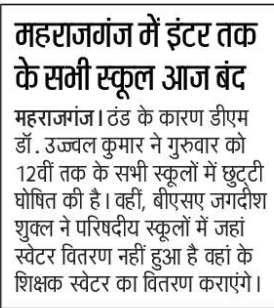 महराजगंज : डीएम के आदेश अनुक्रम में अत्यधिक ठंड के मद्देनजर 26 दिसम्बर को इंटरमीडिएट तक के विद्यालय रहेंगे बंद।