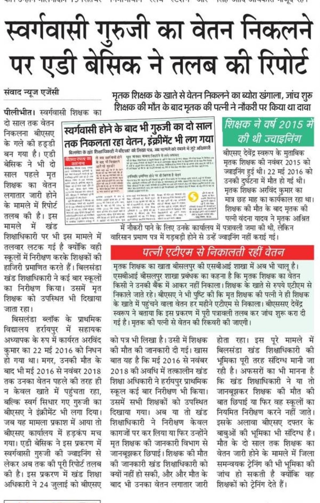खंड शिक्षाधिकारी ने बीएसए को पत्र लिखकर मामले की जानकारी दी तो अब अधिकारी पूरे मामले को दबाने में लग गए। इससे बीएसए दफ्तर की आंख मूंदकर शिक्षकों की हाजिरी प्रमाणित करने की कार्यशैली भी उजागर हुई है। बिलसंडा ब्लॉक के प्राथमिक विद्यालय हर्रायपुर में सहायक अध्यापक के रूप में कार्यरत अरविंद कुमार का 22 मई 2016 को निधन हो गया। मगर, मौत के बाद भी मई 2016 से नवंबर 2018 तक उनका वेतन पहले की तरह ही न केवल खाते में पहुंचता रहा, बल्कि कुछ समय बाद स्वर्ग सिधार गए गुरुजी का बीएसए ने इंक्रीमेंट भी लगा दिया। कुछ समय पहले जब बिलसंडा के खंड शिक्षा अधिकारी को किसी दूसरे शिक्षक ने उस शिक्षक की मौत के बारे में जानकारी दी, तो वह चौंक गए। बिलसंडा के खंड शिक्षा अधिकारी ने 24 जुलाई को इस प्रकरण में बीएसए और वित्त लेखाधिकारी को एक पत्र लिखा। इसमें हर्रायपुर प्राथमिक विद्यालय के शिक्षक की मौत की जानकारी देते हुए दो साल का वेतन रिकवरी करने की बात कही गई। यह जानकारी होते ही बीएसए दफ्तर में हड़कंप मच गया। सूत्रों के अनुसार, बीएसए ने आनन-फानन में बिलसंडा खंड शिक्षा अधिकारी को अपने दफ्तर बुलाकर मामला और ज्यादा न खोलने पर बात कही.